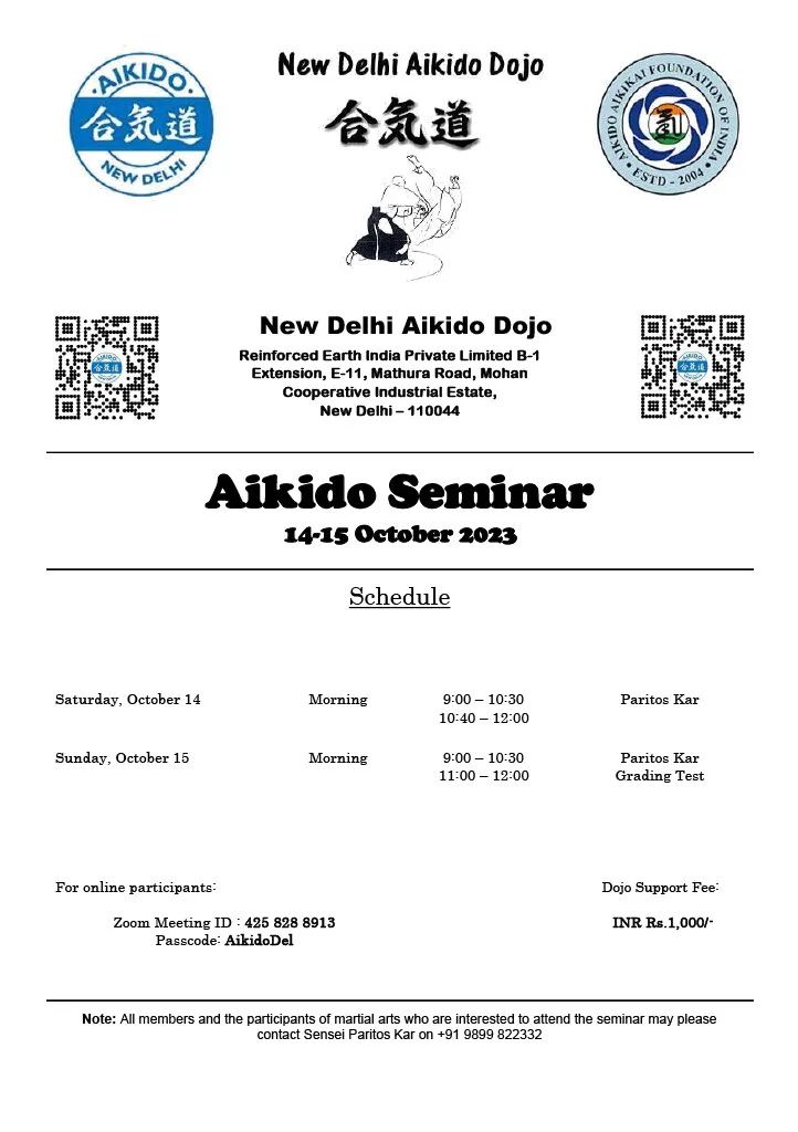 All members and the practitioners of martial art who are interested to attend the Seminar may please contact Paritos Kar on +91 98 9982 2332.Aikido evening class